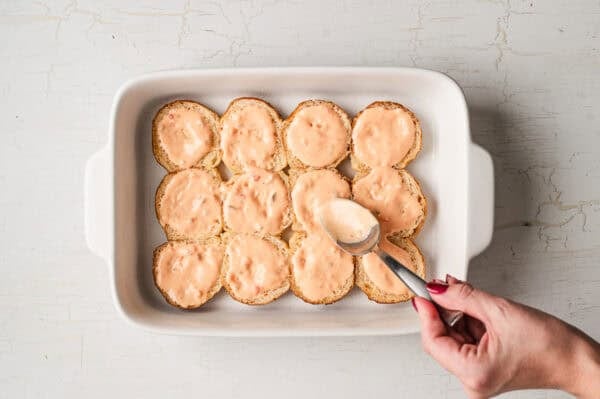 - Place 12 (3-inch) pretzel roll bottoms in the pan. Spread with 1/2 cup Thousand Island dressing.