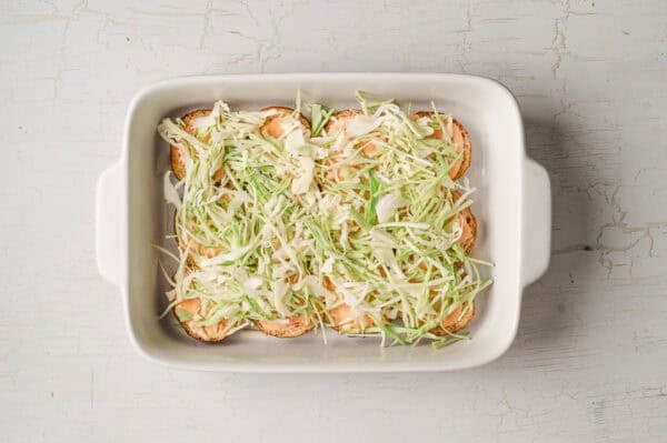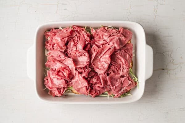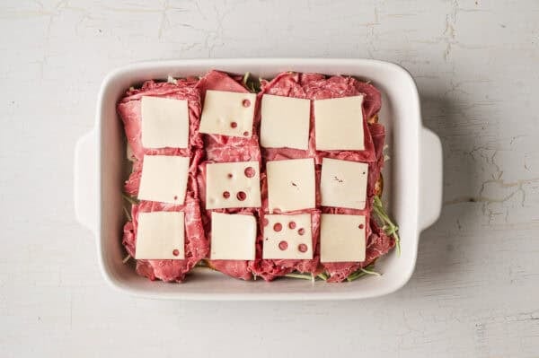 - Top the cabbage with 1 pound thinly sliced corned beef.