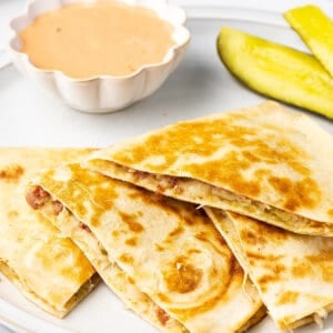 - Slice the quesadillas into 3 wedges each. Serve with dill pickle spears and place the remaining dressing in a little bowl for dipping.