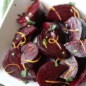 Tender roasted beets are coated with an orange and maple glaze that makes for a fantastic and super easy side dish, great for the holidays and all year round!