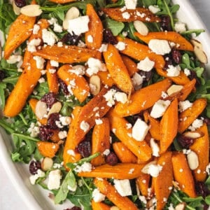 Made with arugula, cranberries, and feta, this Roasted Carrot Salad is a quick and easy winter salad recipe. It’s light, fresh, healthy, and so pretty! Serve this as part of a holiday feast, small dinner parties, or even potlucks – it always receives rave reviews, and everyone loves it.