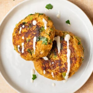 Fresh from the pan, these salmon patties are great dipped in a side of Tzatziki for a delicious appetizer. For more of a meal, I like to serve them with some vegetables like roasted asparagus or roasted cauliflower. They also go nicely with a caesar salad or creamy cucumber salad.