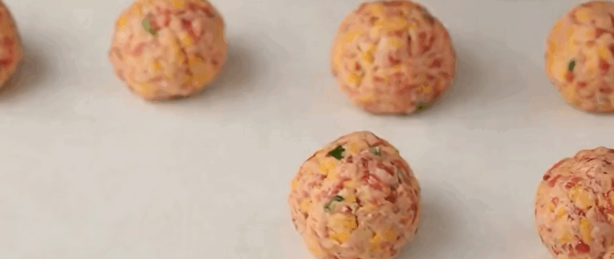 Make the sausage ball mixture: In the bowl of a stand mixer using the paddle attachment, mix 1 lb. ground pork sausage, 2 cups shredded sharp cheddar cheese, 2 cups Red Lobster cheddar bay biscuit mix, ¼ cup buttermilk and 1 scallion on low speed until evenly combined. If you don’t have a stand mixer, use a wooden spoon and then your hands to work the ingredients into a dough.