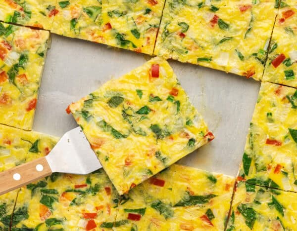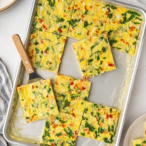 I like to cut my sheet pan egg frittata into squares and serve them with a side of toast. Since this serves a crowd, it’s perfect for weekend breakfasts with the family or brunch with friends. To turn it into a bigger meal, you could add a side of breakfast sausage or bacon and some home fries or hash browns.