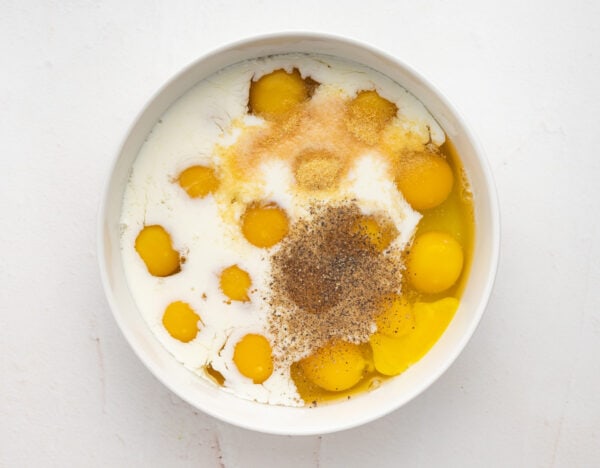 - In a large mixing bowl, vigorously whisk together 16 large eggs, 1/4 cup whole milk, 1/2 teaspoon salt, 1/4 teaspoon pepper, and 1/4 teaspoon garlic powder until the eggs are light, fluffy, and pale in color.