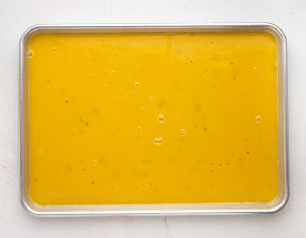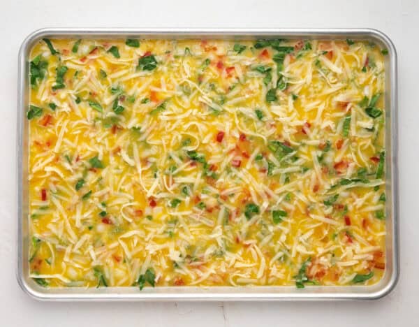 - The size of the pan matters. I used a rimmed half sheet pan (18×13) for this sheet pan frittata as written in the recipe. If you don’t have a pan that size, you can make these eggs in a 9×13 casserole dish, but you will need to reduce the eggs from 16 down to 12. You will also need to adjust the baking time slightly (just watch until the eggs are set in the middle) and, of course, you’ll get fewer servings.