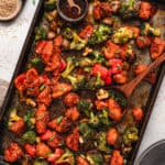 My sheet pan beef & broccoli recipe inspired me to recreate another one of my family’s favorite Chinese takeout dishes – General Tso’s chicken. While this recipe isn’t an exact copycat you’d get at a Chinese restaurant, it maintains the most important flavors using popcorn chicken, a mix of veggies, and General Tso’s sauce. The best part is it’s super quick and easy with only 1 pan to clean, and no deep frying!