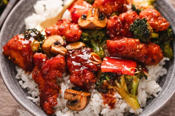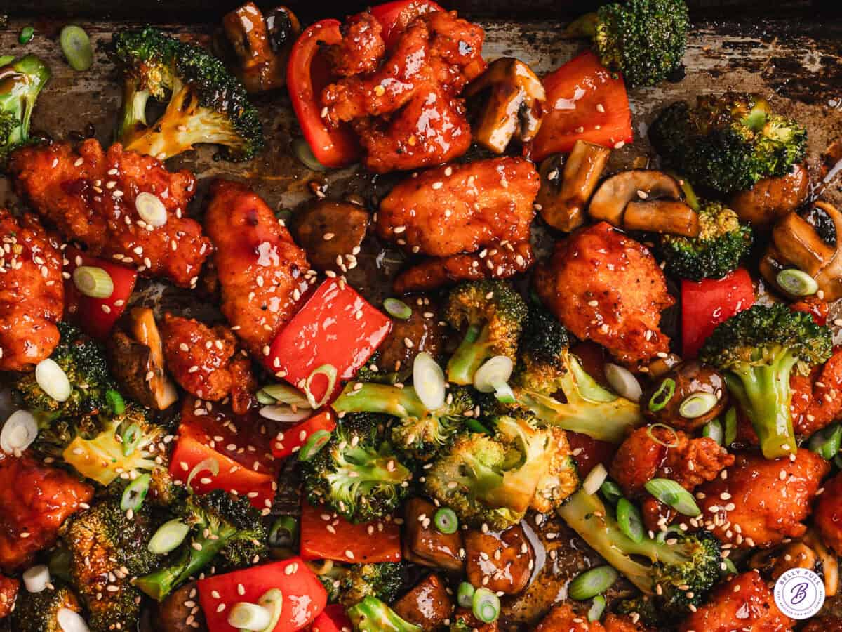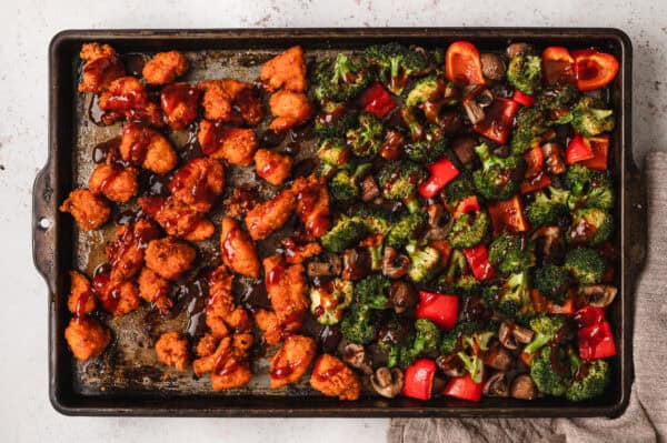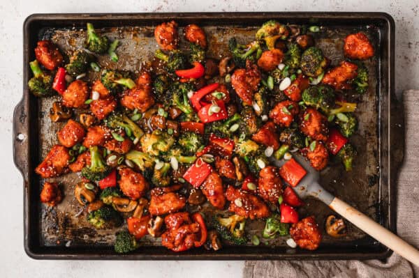 This Sheet Pan General Tso’s Chicken recipe is a great alternative to Chinese takeout. It’s lighter, loaded with veggies, and ready in just 35 minutes. I love that there’s only one pan to clean up after dinner! I usually serve this with steamed white rice, though fried rice is great too.