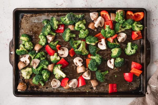 - Place one cut bell pepper, 3 cups broccoli florets, and 6 quartered mushrooms on the baking sheet. Drizzle 1 tablespoon vegetable oil over the top and sprinkle with 1/4 teaspoon salt, 1/4 teaspoon pepper, and 1/8 teaspoon red pepper flakes. Toss to coat. Move them to one side of the baking sheet.