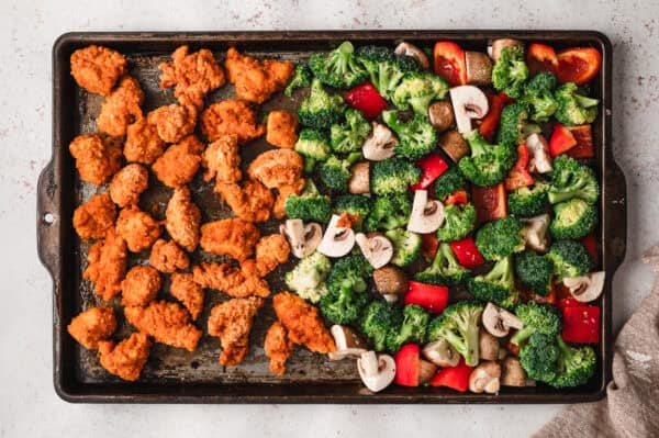- Use breaded popcorn chicken. Using frozen breaded chicken helps make this sheet pan General Tso’s chicken quick and easy. I love the Just Bare brand, which is very lightly breaded. Feel free to use any that you have on hand, though.