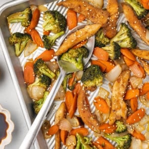 This Teriyaki Chicken sheet pan dinner is a favorite, where chicken and vegetables are coated in a sweet and savory sauce and roasted at the same time – you have a complete meal, without having to make a separate side. And super easy clean-up! You can enjoy this on its own, or with a fresh side salad or rice.