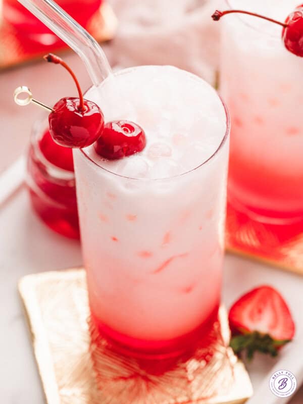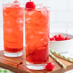 Just three simple ingredients, plus ice – sweet grenadine, ginger ale, and maraschino cherries. People who don’t like ginger ale, swap it out for lemon-lime soda, and some people (like me!) add both. You should try it all three ways and determine which way is your favorite. If you’re trying to cut down on your sugar intake, sugar-free soda can be used, too.
