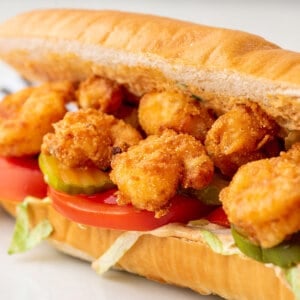 This classic Louisiana Po Boy Sandwich is piled high with golden fried shrimp, crisp shredded lettuce, sweet tomatoes, tangy pickles, and homemade remoulade sauce. Enjoy it for lunch or dinner. It’s crazy delicious!