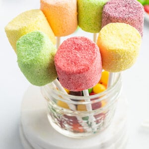 Pretty and fun rainbow marshmallow pops coated in Skittles powder. Perfect for a baby shower, parties, and leftover Halloween candy. Dunk them in vodka for a grown up treat!
