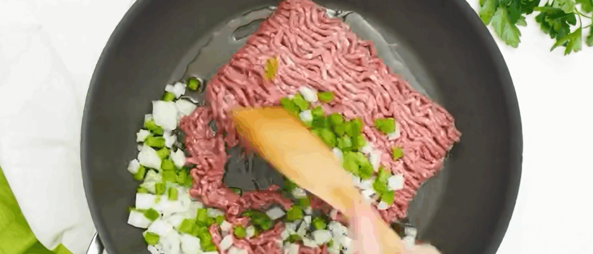 - Warm oil in a large nonstick skillet over medium-high heat. Add beef, onion, and bell pepper; breaking up the meat into very tiny crumbles with a wooden spoon. Cook for about 5 minutes until beef is cooked through and vegetables are tender. Stir in garlic and cook until fragrant, about 30 seconds. Drain off grease.