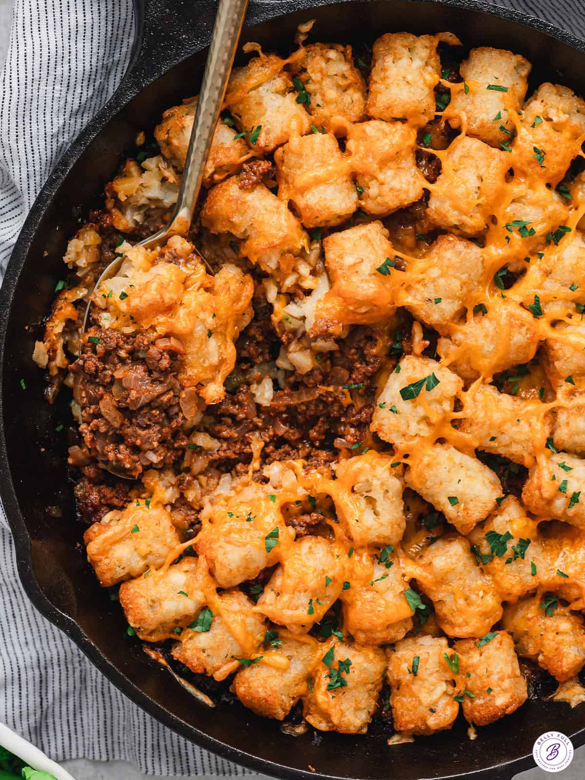 Bake the casserole: Transfer the skillet to the oven and bake uncovered until the tater tots are golden brown and crisp and the filling is bubbling around the edges, about 30-35 minutes. If the tots are browning faster than the filling is bubbling, tent the skillet loosely with foil during the last 10 minutes of baking.