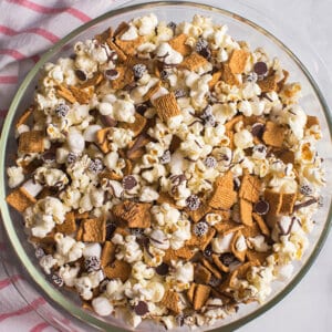 It’s best enjoyed immediately of course since popcorn tends to go stale quickly and the chocolate will soften, but you’d be fine to make it 1 to 2 days ahead if you have to. Be sure to keep it in a tightly sealed container or ziploc bag at room temp.