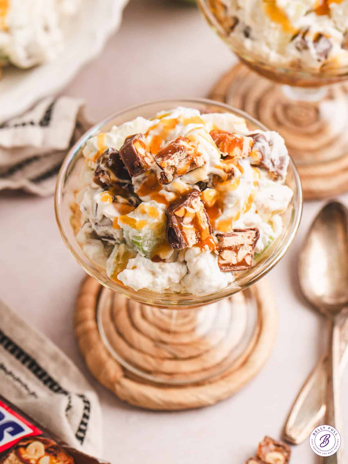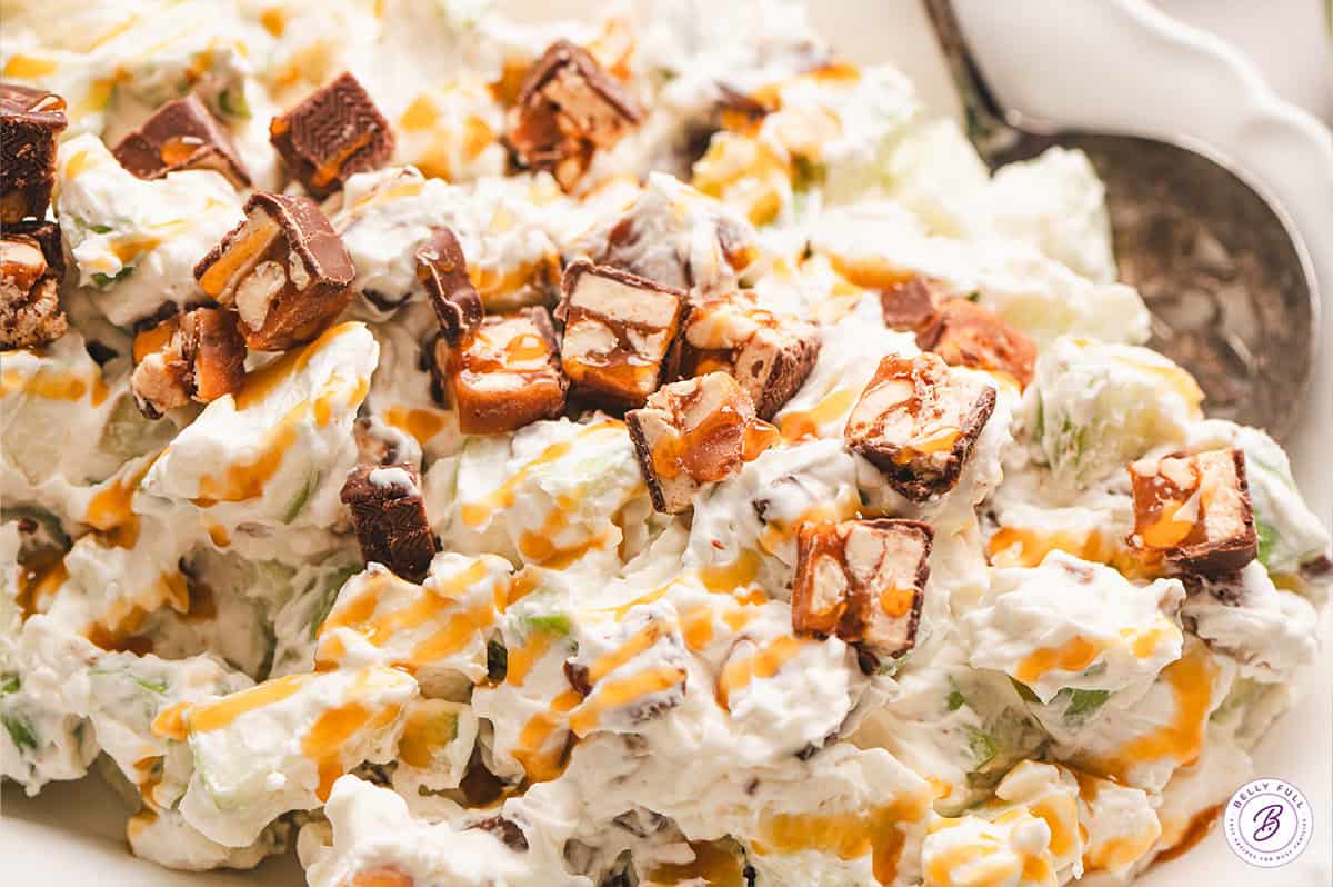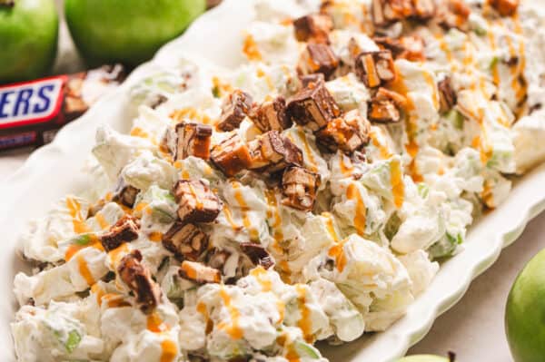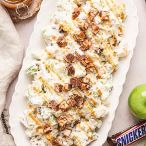 I love to serve Snickers salad as a summertime dessert. It’s sweeter than other fruit salads and has more of a dessert element, but still light. For an extra dessert twist, finish the salad with a drizzle of caramel sauce or chocolate sauce. It’s also great for potlucks and picnics, alongside other summer favorites like hawaiian pineapple chicken kabobs and turkey burgers.