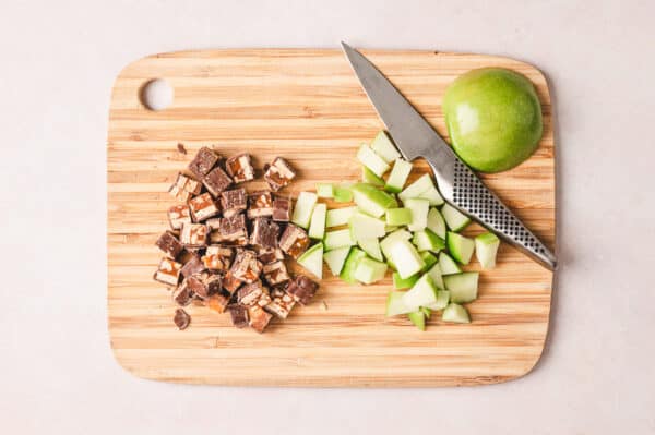 - Dice the snickers candy bars and Granny Smith apples into small 1/2-inch pieces.