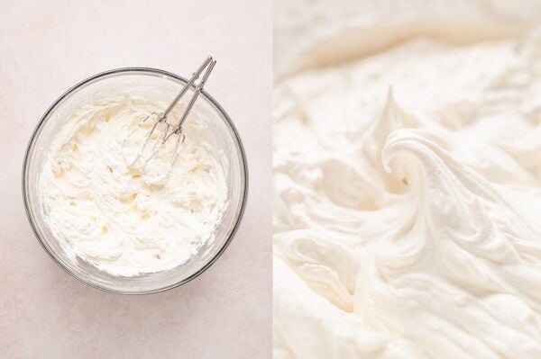 - In a large bowl with a hand held electric mixer, blend the softened cream cheese until smooth. Add cold heavy whipping cream, powdered sugar, and vanilla. Beat to stiff peaks.