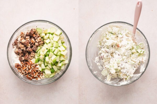 - Gently fold in chopped apples, Snickers bar pieces, and toasted chopped pecans.