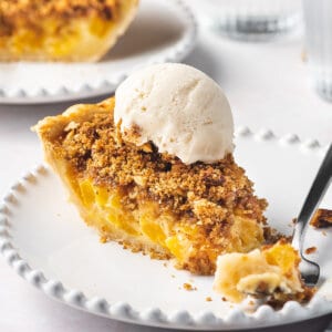 I find this pie tastes great straight from the fridge or at room temperature. Sometimes, I’ll pop it in the microwave to warm up a slice and serve it with a scoop of vanilla ice cream or fresh whipped cream. Sometimes I even drizzle it with caramel sauce!
