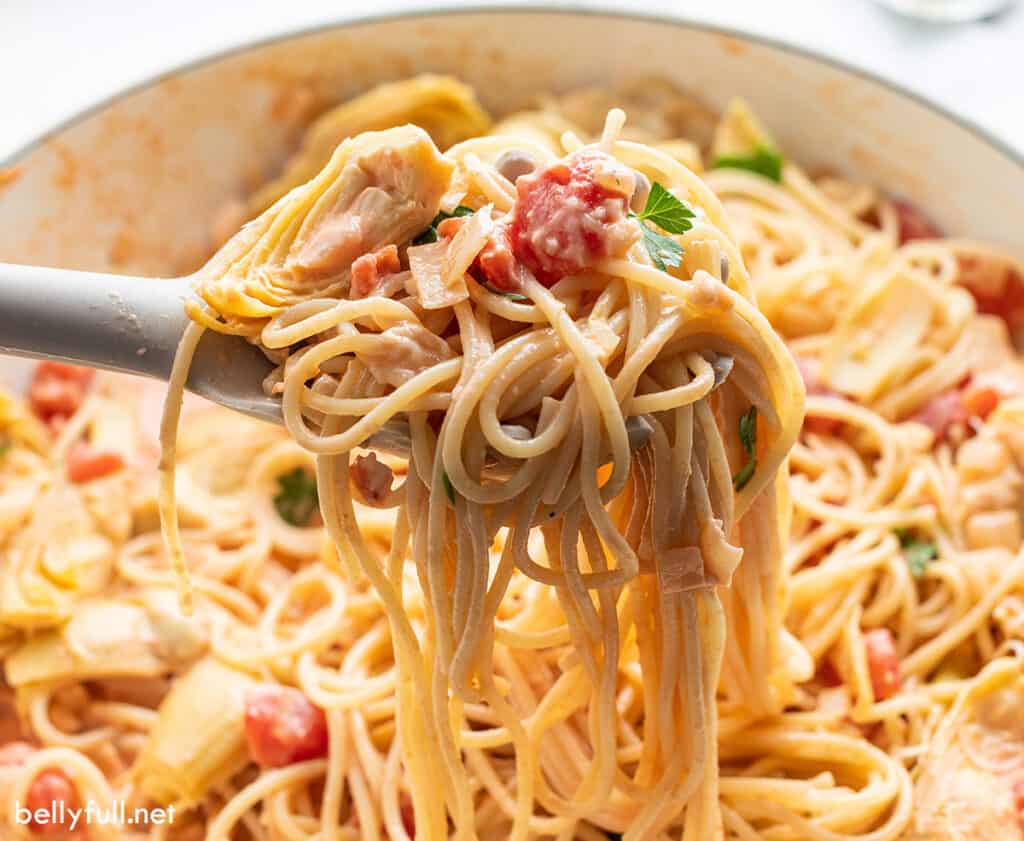We can just file this Artichoke Pasta under my-belly-is-so-full-but-my-mouth-wants-more category. Surely, there is such a thing, right? I adore this dish, it’s so incredibly easy and bursting with great flavor.