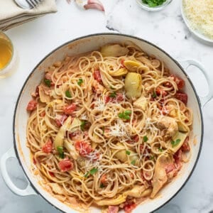 Tomatoes, artichokes, and cream come together in this delicious 20 minute Artichoke Pasta recipe. A super quick and easy dinner that’s great for any night of the week.