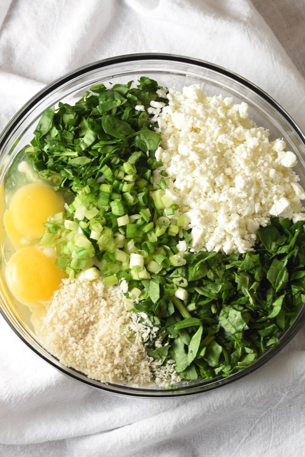 - In a large bowl, mix together the spinach, feta cheese, eggs, scallions, garlic, and seasonings until blended.