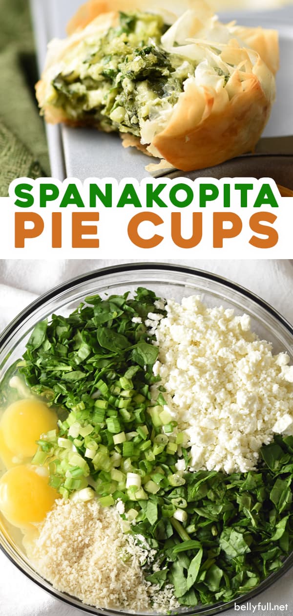 I decided to make Spanakopita Muffin Cups, which are little mini versions, still filled with spinach, feta cheese, herbs, and butter in a flaky phyllo shell.