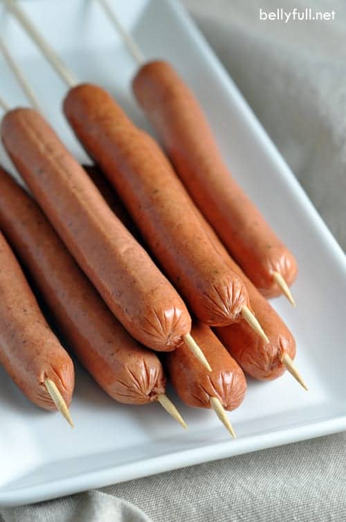 - Thread on skewers. Slowly push a skewer (metal or wood) through the center, lengthwise, of the hot dog as best you can. Try to keep it straight. (Hot dogs are pretty forgiving, so if you mess up, just gently pull it out and try again.)
