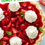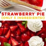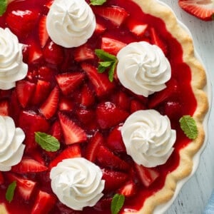 This easy 5-ingredient strawberry pie is one of my favorites. I use fresh strawberries, mix them with a special jello filling and glaze, pour it all into a flaky pie crust, and let it chill until it’s perfectly set. Before serving, I top it off with dollops of homemade whipped cream.