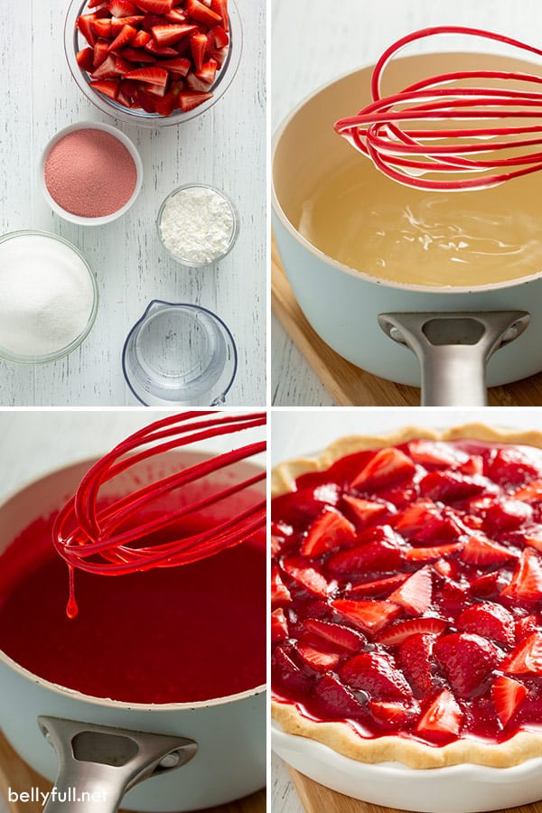 Prepare the filling: In a medium saucepan, bring 2 cups of water, 2 cups of sugar, and 6 tablespoons of cornstarch to a boil, stirring, until thick and clear. Remove from the heat and stir in the strawberry jello packet. Mix well and let cool.