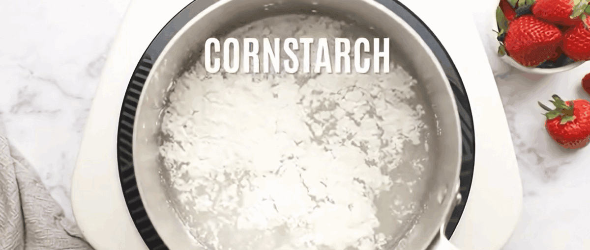 - In a medium saucepan, bring water, sugar, and cornstarch to a boil, stirring, until thick and clear. Remove from heat and stir in the strawberry jello packet. Mix well and let cool.