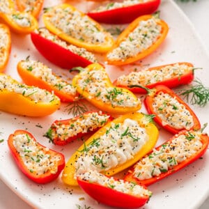 Seal any leftovers in an airtight container with a sheet of parchment paper between any layers. They will keep in the fridge for up to 3 days. I don’t recommend freezing these stuffed mini peppers – they don’t thaw well, unfortunately.