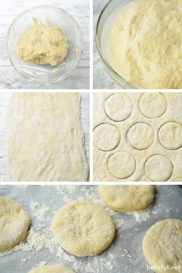 - Using a sharp two-inch cookie cutter, stamp out as many circles as possible (I always get 24) and transfer to the floured baking sheet, leaving about 1" between them. Sprinkle the rounds lightly with flour, cover with plastic wrap, and let rise 10-15 minutes.