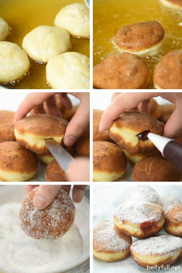 You can also freeze the jelly donuts. After frying, allow them to cool completely. Lay flat in a single layer on wax-paper-lined baking sheets (or stack with layers of wax paper in between.) Chill in the freezer for 2 hours (but not longer)—this will allow them to set a bit without affecting the texture of the dough, and allow the jam inside to begin solidifying. Transfer donuts to a freezer-safe plastic container and stack with wax paper in between the layers, and secure with the lid (you can also use a freezer Ziploc bag, but your donuts are more likely to stick together). Freeze for up to 2 months.