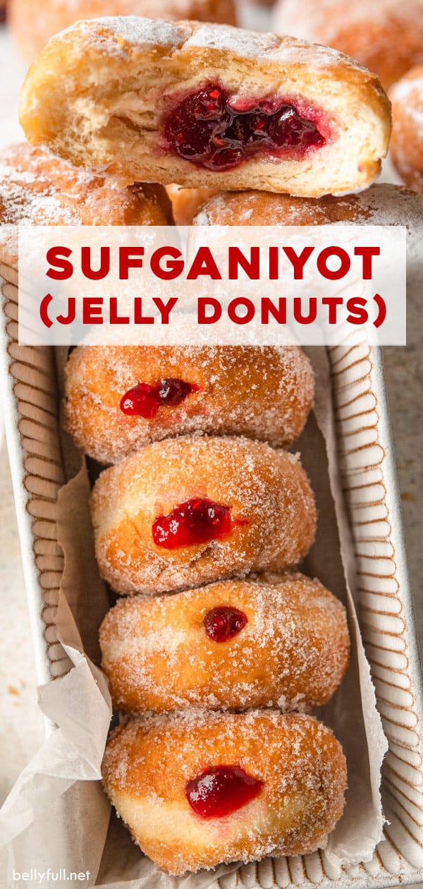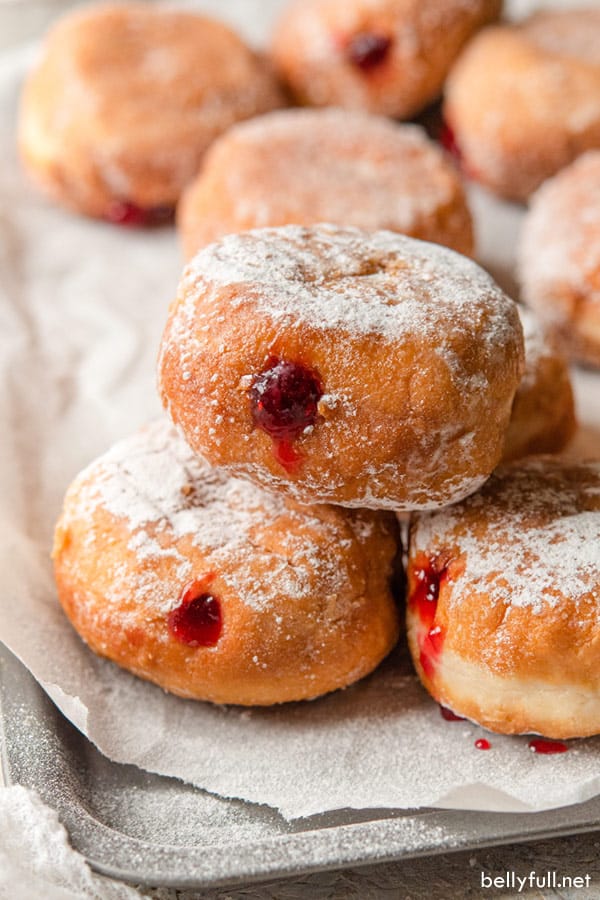Deep fried pillowy Sufganiyot Jelly Donuts are the ultimate Hanukkah treat! Dusted in regular sugar or powdered sugar, I find them completely irresistible! My Hanukkah table is never complete without a batch of these decadent donuts.