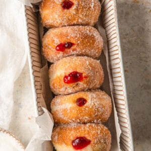 Homemade jelly donuts are best enjoyed right away, but leftovers can be kept at room temperature, covered, for several hours or in the refrigerator for up to a week. Keep in mind, the longer you have them in the fridge, the drier the dough will become. If you’re planning on freezing them, don’t chill them first.
