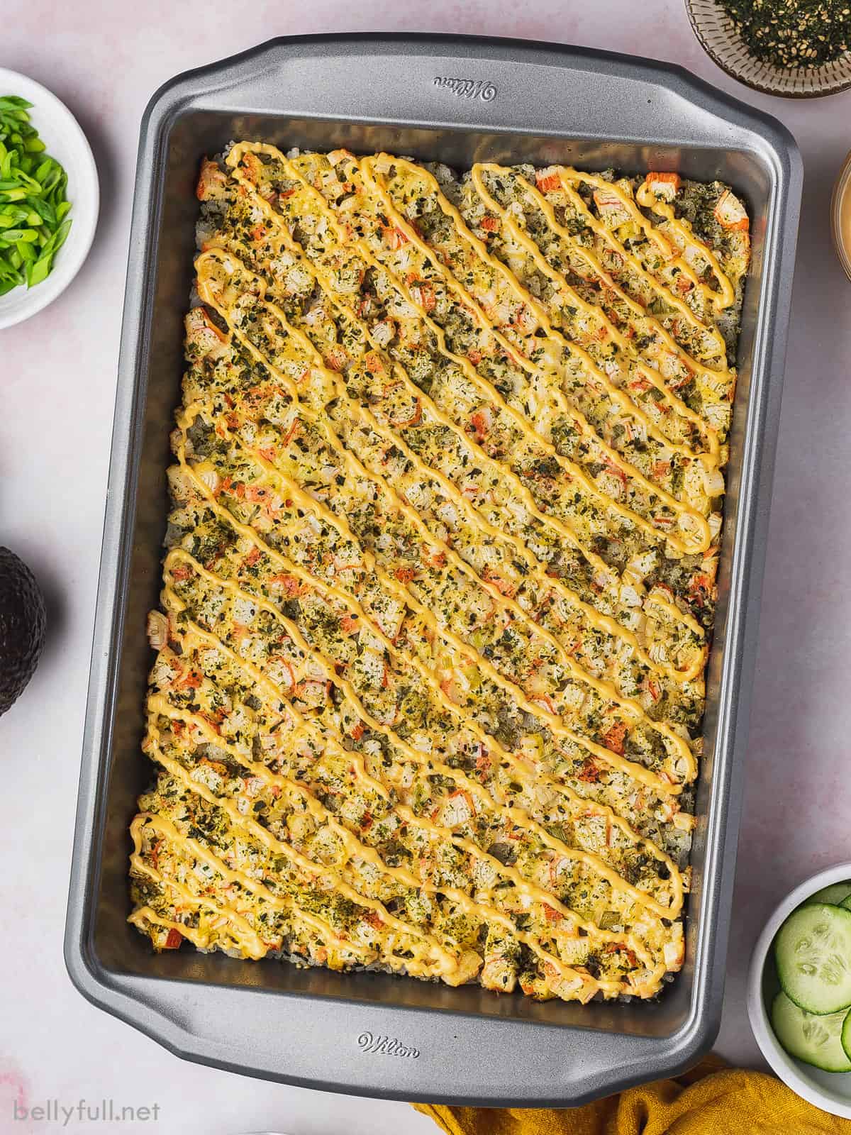 Add toppings and bake: Sprinkle 2 tbsp of furikake evenly over the rice, then spread the spicy crab mixture on top of that. Cover with 2 tbsp furikake.