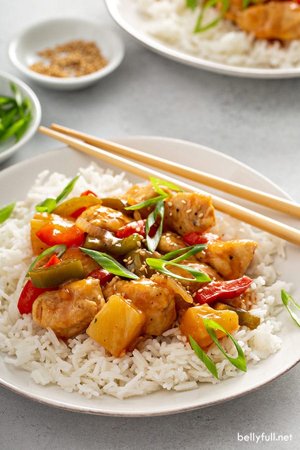 I’ve simplified this classic dish (and also made it slightly healthier) by omitting the batter and massive oil needed for deep-frying. The chicken pieces do still get coated in cornstarch, though, and pan-fried in a skillet without being touched for a few minutes to develop a nice brown crisp exterior. The chicken still ends up moist and so delicious!