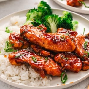 I typically serve this sweet & spicy sticky chicken over rice with a side of roasted broccoli. While I used regular white rice, fried rice or cauliflower rice would be great too.