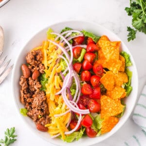 - Doritos: It wouldn’t be a taco without a taco shell and since we’re making a taco salad, we include Doritos! Feel free to replace them with regular tortilla chips or even corn chips, if preferred. Also? Buy an extra bag of Doritos and make this Dorito Chicken Casserole!
