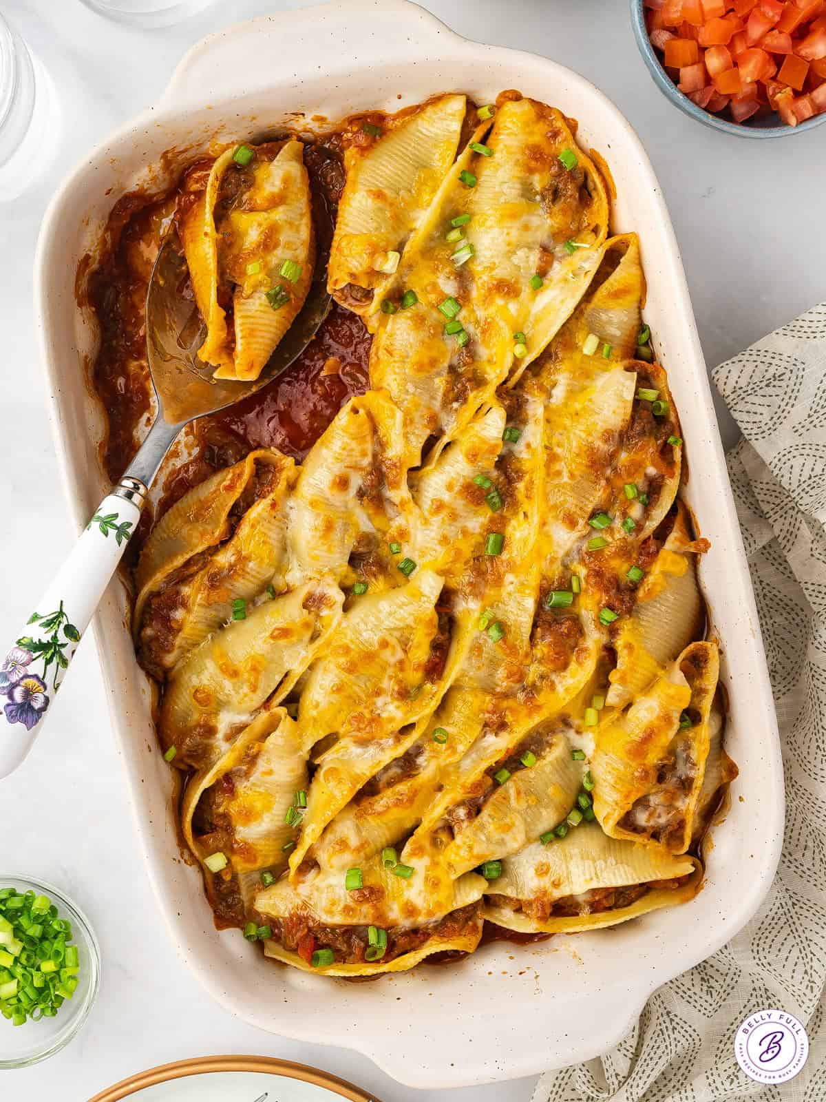 Today’s recipe combines two popular and well loved dinners – tacos and stuffed shells. Instead of being stuffed with cheese and pasta sauce, the jumbo pasta shells are filled with a mixture of seasoned ground beef, diced tomatoes, salsa, and cheese. The shells are topped with even more cheese to make these extra cheesy.