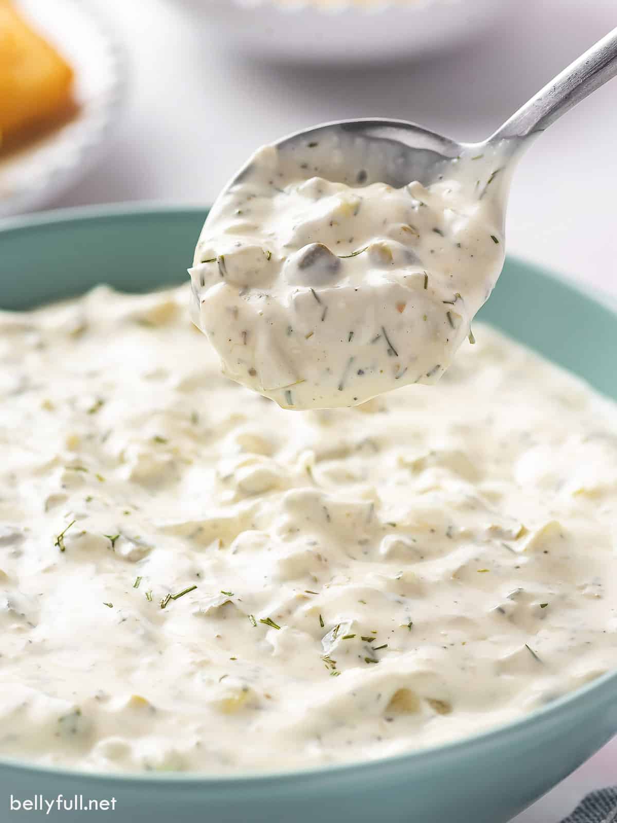 Tartar sauce is a condiment often served with seafood, like fried oysters and shrimp, and fish. It has a mayonnaise base and is usually made with pickles, capers, and herbs plus a little lemon juice. It usually has a slightly sweet, slightly savory, and overall tangy flavor that pairs nicely with fried foods. Some like to take a shortcut and make it with just mayonnaise and relish, but I find that flavor profile to be lacking, so I like to make it myself from scratch.