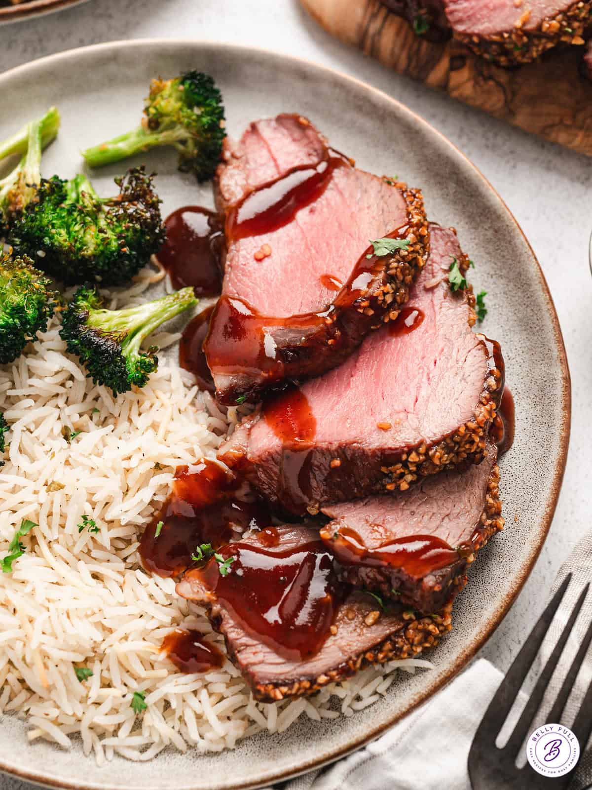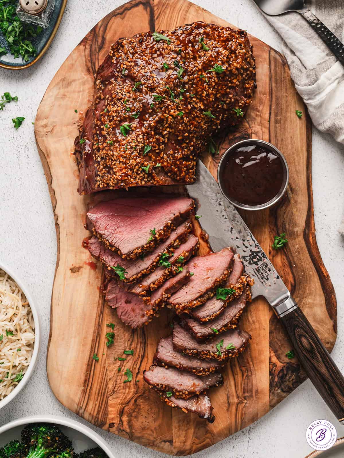 This tri-tip recipe is so simple with a 2-ingredient sweet and tangy glaze and a layer of dried garlic, yet it’s so incredible. I’ve often joked that if I had to choose a last meal on earth, it would be this tri tip, along with the rice pilaf and roasted broccoli. I would die happy.