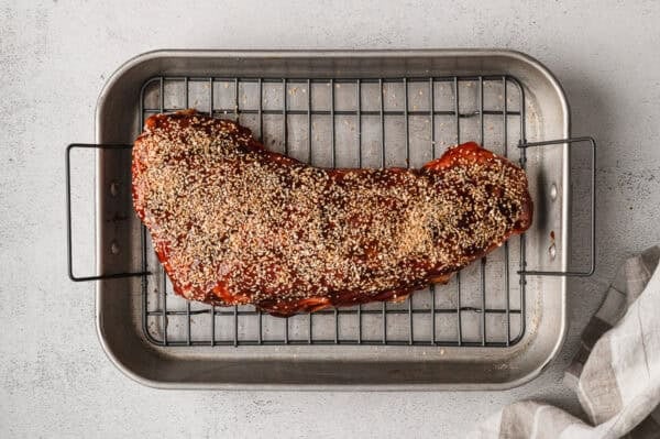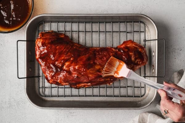 - In a small bowl, mix the BBQ sauce and Teriyaki sauce together (set 1/4 cup aside.) Use the remaining sauce to coat both sides of the roast.