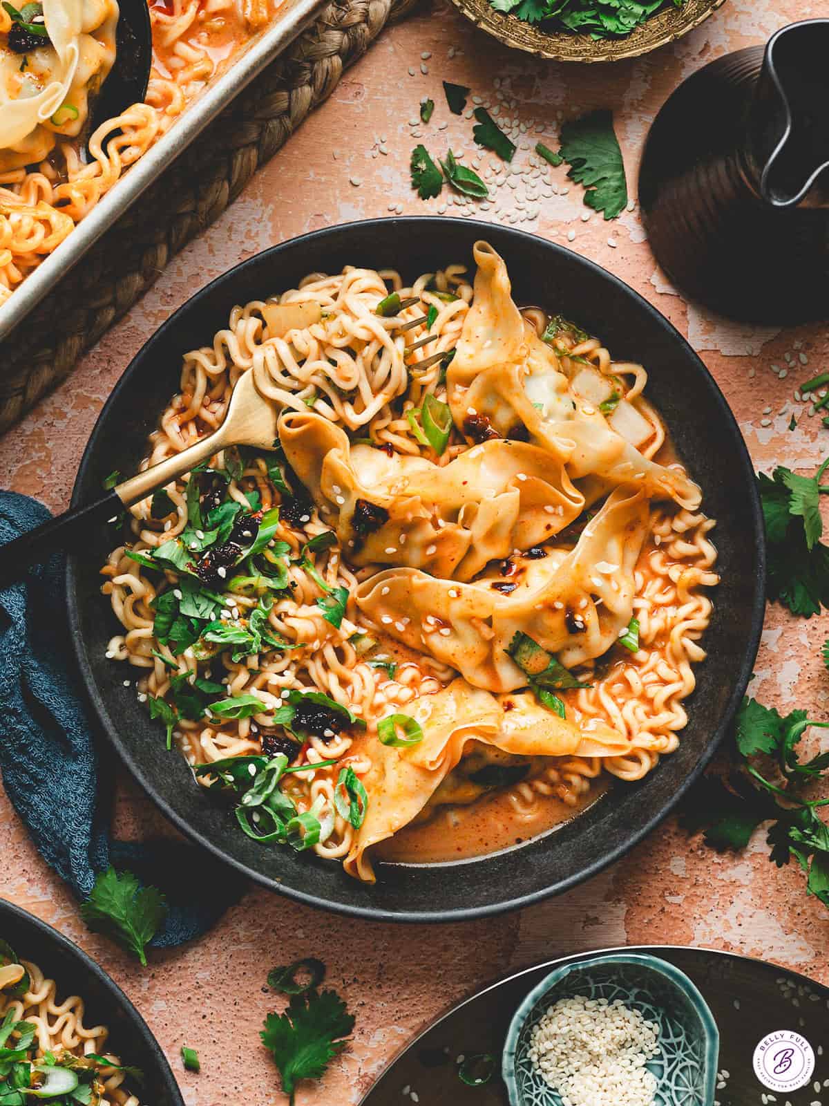 Garnish and serve: Spoon the noodles and dumplings into bowls, making sure to ladle some of the flavorful pan sauce over each serving. Enjoy!