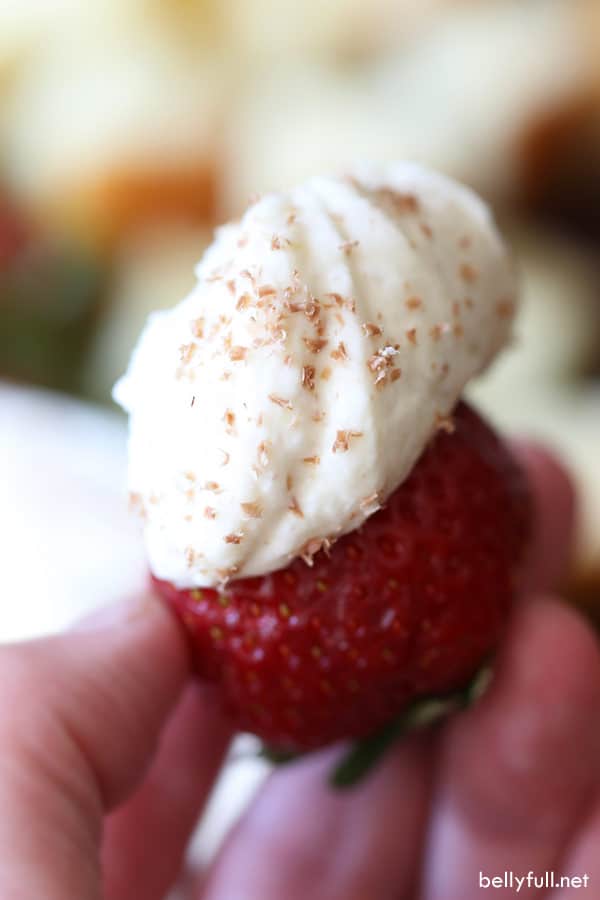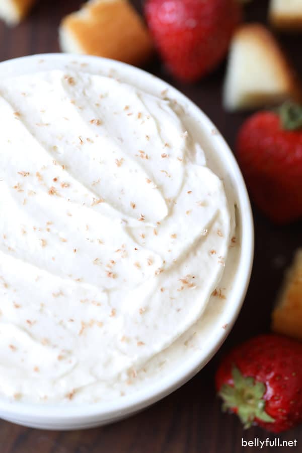 - Place dip in a serving bowl and give it a swirl with a spatula for texture. Lightly dust with cocoa powder (I use sweetened, since unsweetened is bitter, but use whichever you prefer.) Serve with ladyfingers, pound cake cubes, shortbread cookies, and/or fresh strawberries for the dippers!