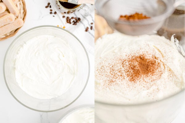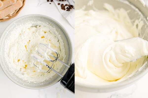 - In a large bowl with an electric mixer, beat 16 ounces softened mascarpone cheese until smooth. Beat in 2 cups cold heavy cream and 2/3 cup powdered sugar, until light and fluffy, about 1-2 minutes. (Don’t overbeat – mixture should be soft and light with volume, but not clumpy.)